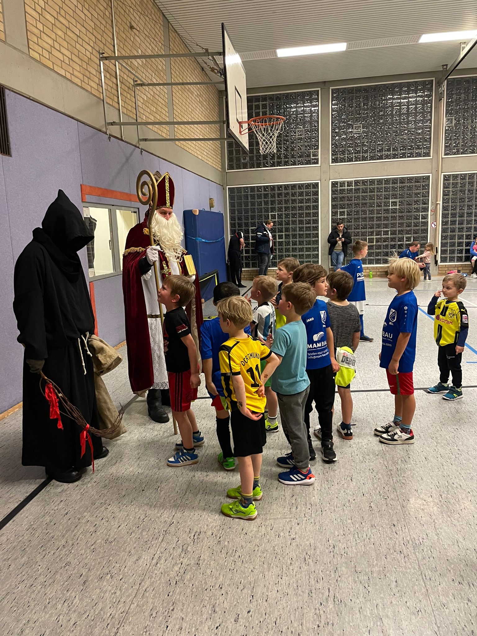 Am Freitag, den 06.12.2024, erlebten die Kinder der G- und F-Jugend des SV Dickenberg ein ganz besonderes Training. Der Nikolaus und Knecht Rupprecht machten Halt in der Barbara-Halle und überraschten die kleinen Fußballerinnen und Fußballer. Mit viel Freude wurde gemeinsam ein Lied gesungen, bevor jedes Kind ein kleines Geschenk erhielt. Die Begeisterung war groß, und alle Kinder freuten sich über den besonderen Besuch.