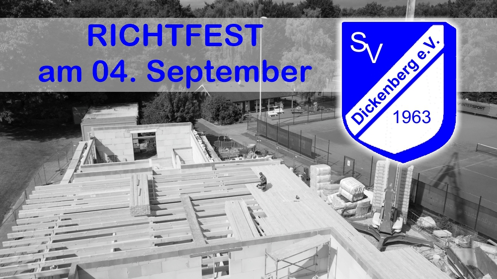 Ein weiterer Meilenstein beim Neubau ist erreicht. Am Donnerstag den 4. September folgten rund 200 Mitglieder der Einladung des Vorstandes und besuchten die Veranstaltung im Waldstadion. Einmal mehr zeigte sich, wie groß das Interesse der Dickenberger in Bezug auf den Neubau ist. Die Geschäftsleitung der Firma Woitzel, sowie die Nachbarschaft der Heinrich-Brockmann-Straße hatte für diesen Tag einen Richtkranz gebunden, der dann am höchsten Punkt des neuen Gebäude befestigt wurde. Christoph Pelster, Chef der Firma Holzbau Pelster und verantwortlicher Zimmermann, ließ es sich nicht nehmen den Richtspruch zu verlesen.